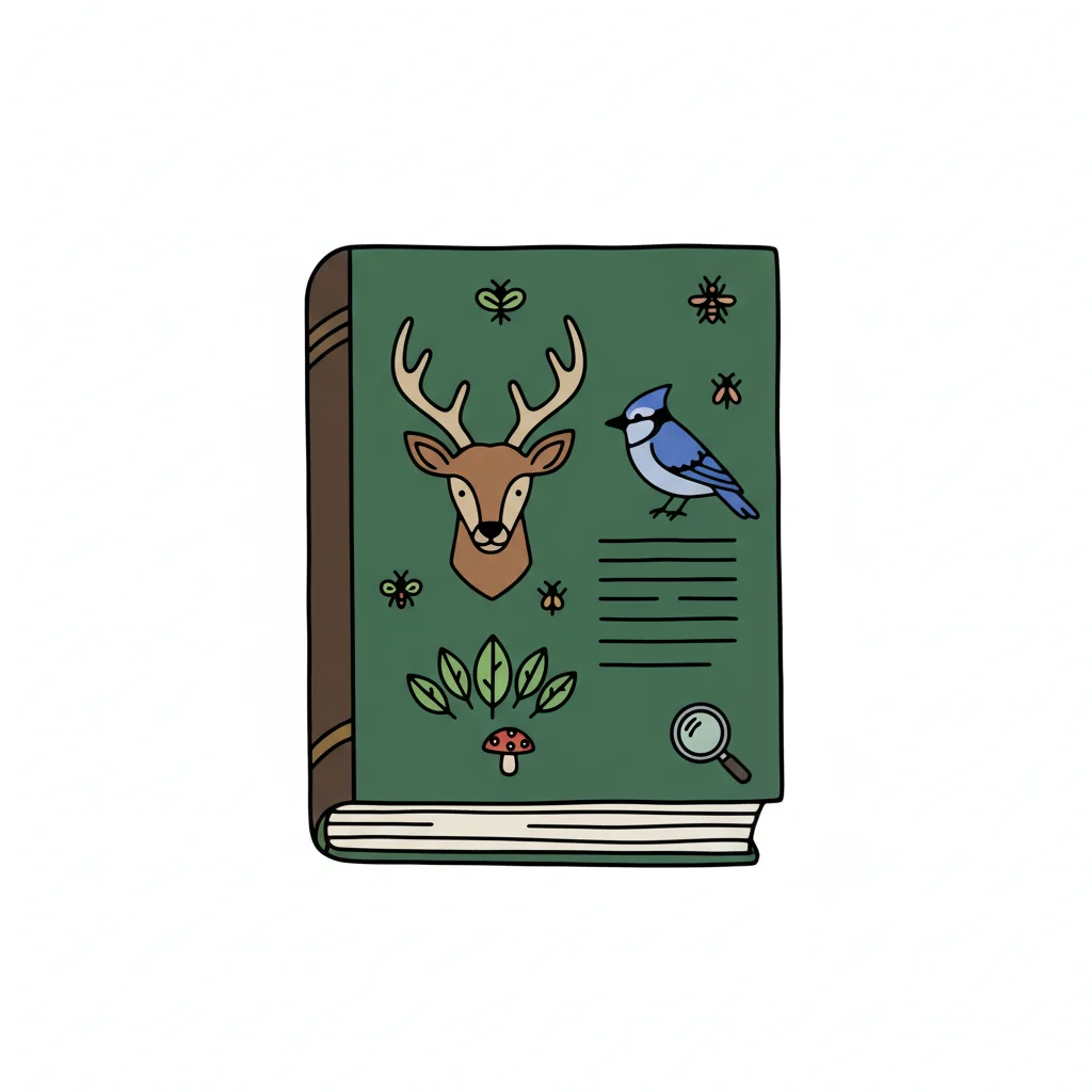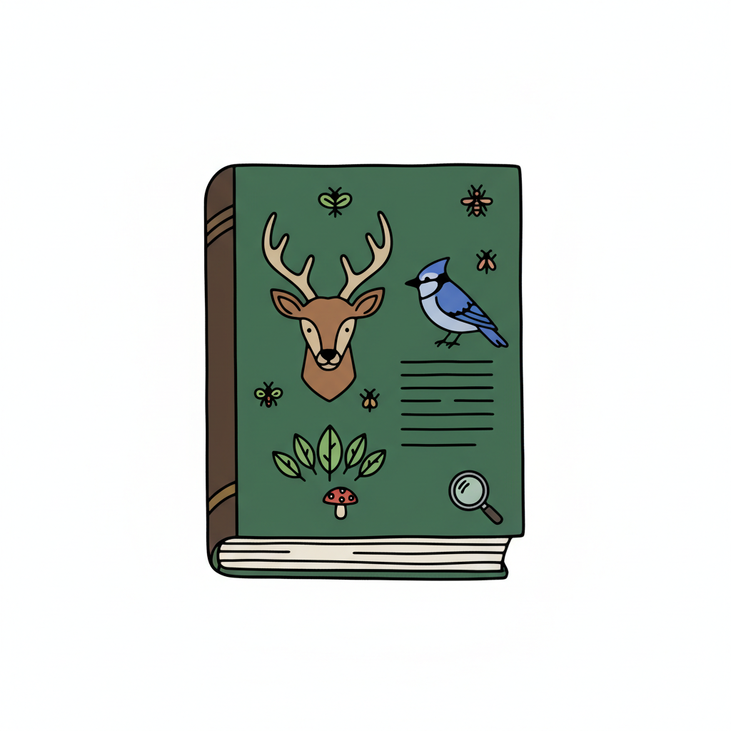 Illustriertes grünes Buch über Natur mit Hirsch, Vogel, Pilz und Lupe.