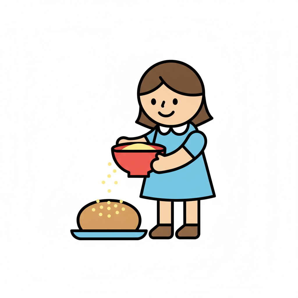 Ein Cartoon-Mädchen streut gelbe Körner aus einer Schüssel auf ein Brot.