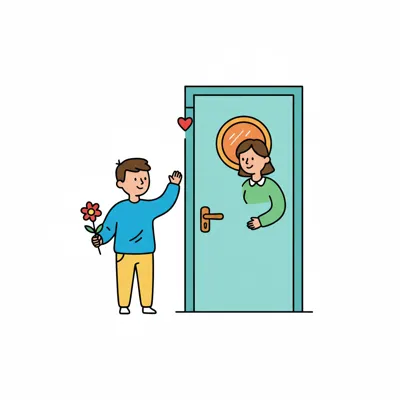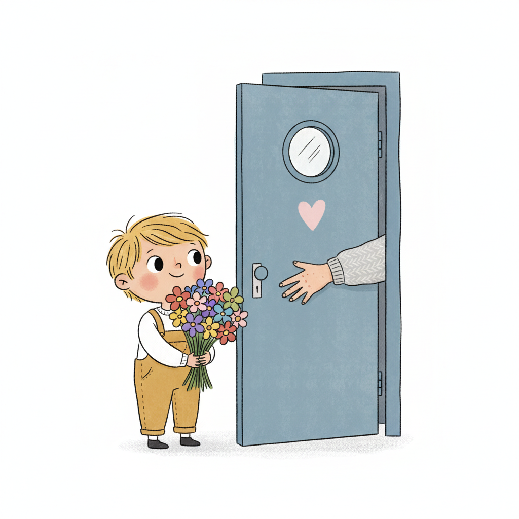 Ein Junge mit Blume winkt einer Frau zu, die aus einer Tür schaut. Ein Herz symbolisiert Zuneigung.