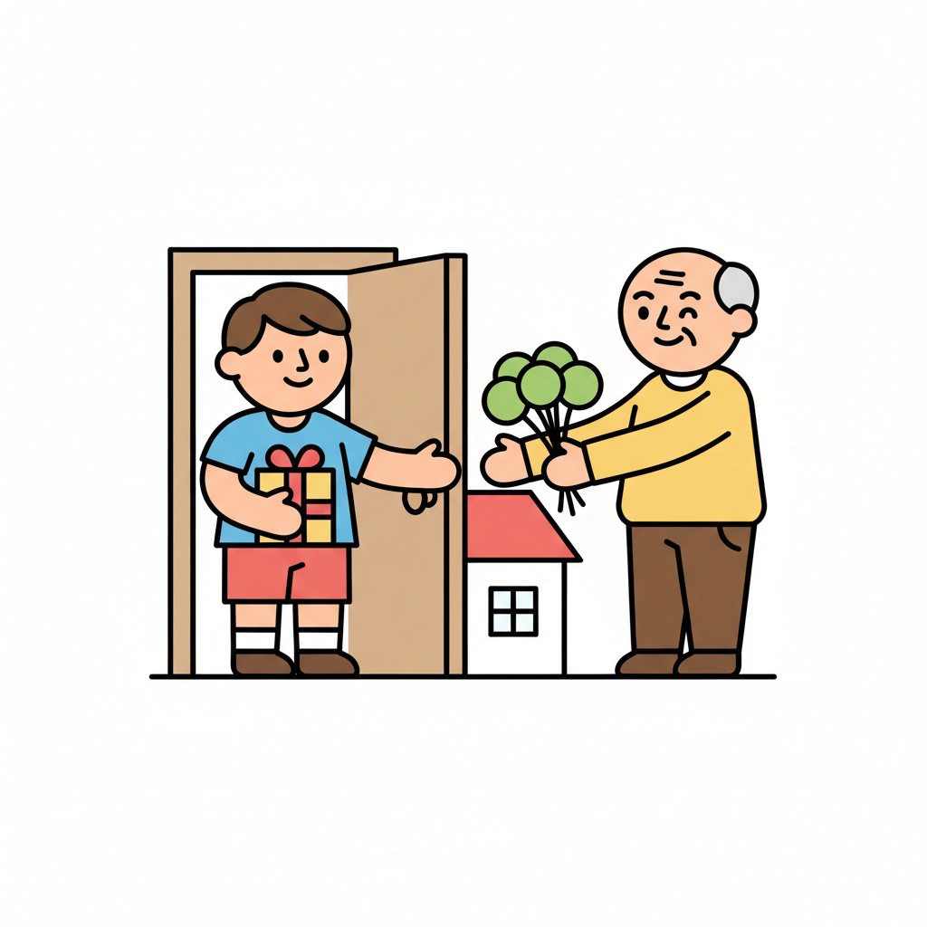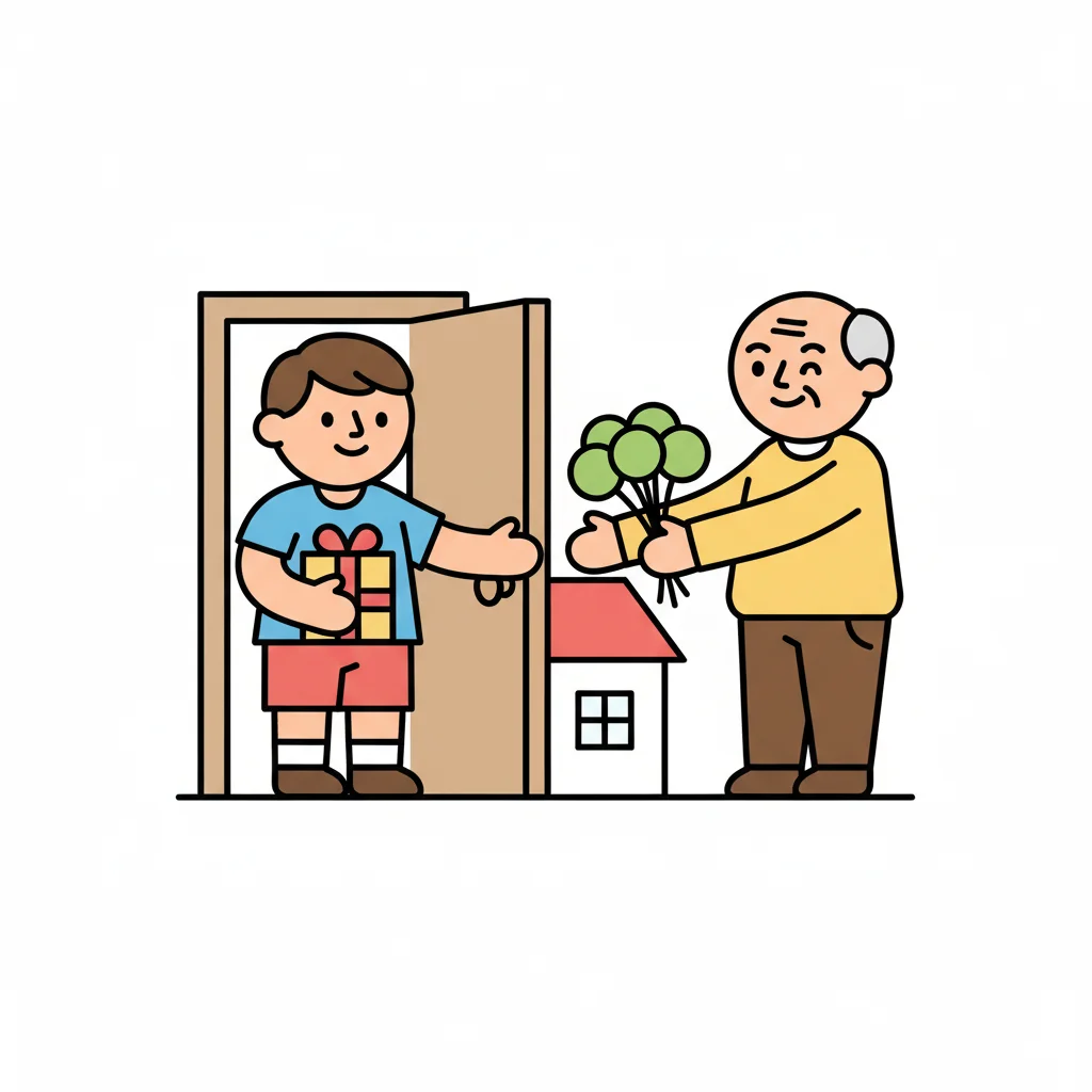 Junge mit Geschenk trifft älteren Mann mit Blumen an der Tür.