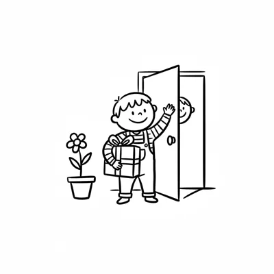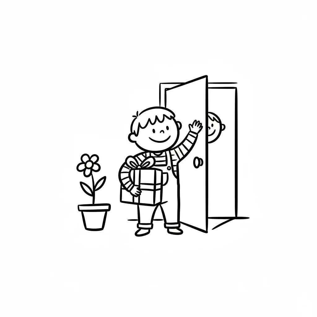 Ein lächelnder Junge mit Geschenk steht vor einer offenen Tür, dahinter winkt jemand.