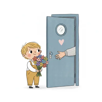 Niedlicher Junge mit Blumenstrauß vor offener Tür, eine Hand streckt sich entgegen.