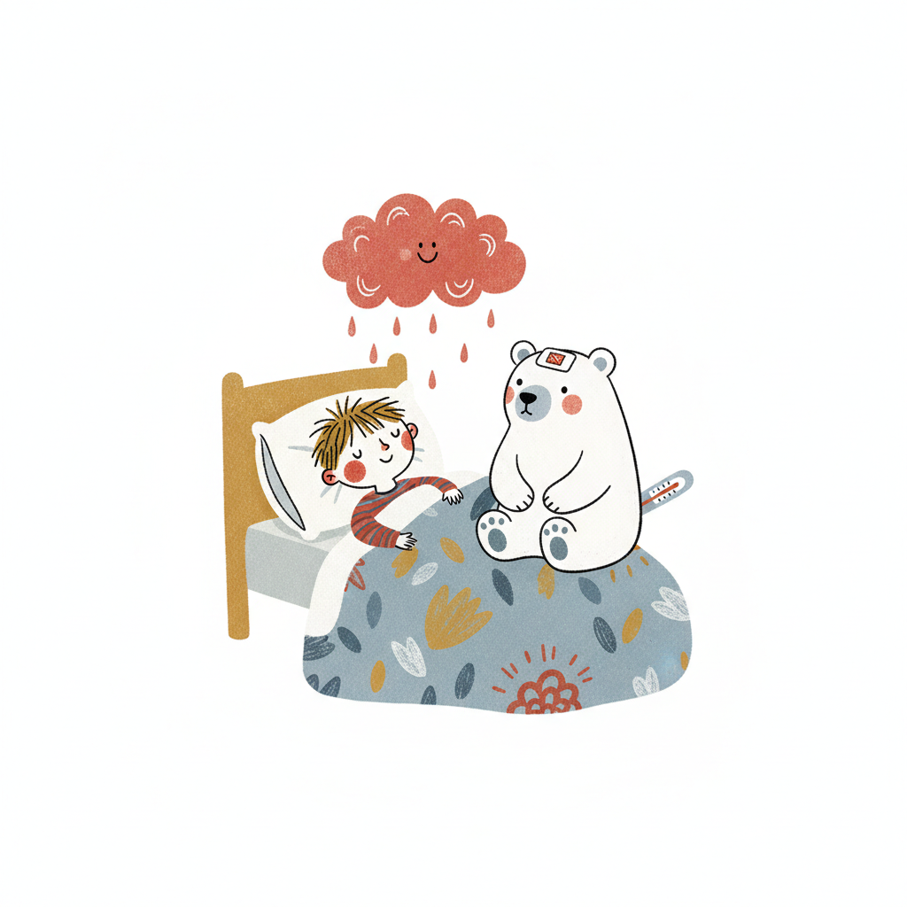Ein Junge im Bett mit einem Bären und einer wolkenförmigen Tränenwolke.