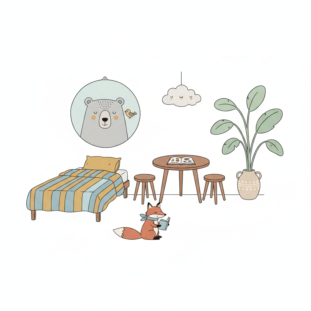 Niedliches Kinderzimmer mit Bett, Tisch, Pflanzen und einem lesenden Fuchs.