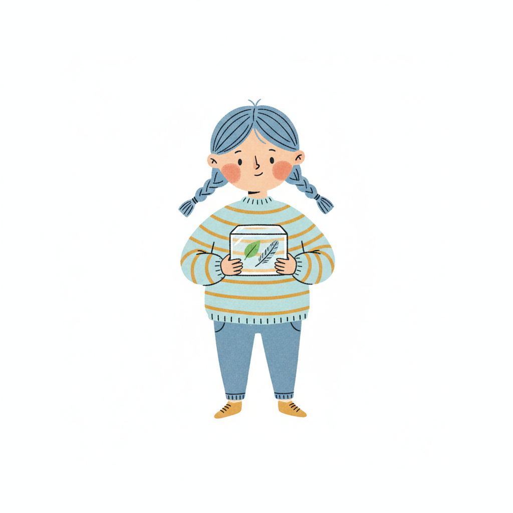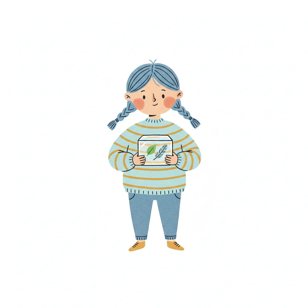 Niedliche, kindgerecht illustrierte Szene mit einem Kind oder einer Person als Hauptfigur, vor rein weißem Hintergrund, im frech-nordischen Aquarell-Skizzenstil. Klare, leicht wackelige Tuschekonturen, sichtbare Pinsel- und Strichtextur, dezente Schraffuren, weiche handgemalte Farbflächen in gedeckten Farben. Einfache, runde Formen. Keine harten Schatten, sondern sanfte, transparente Aquarellschichten. Leicht raue, handgezeichnete Linien statt glatter Vektorkanten. Subtile, vereinzelte Kritzelpunkte oder kleine Details im Hintergrund (wie Pünktchen oder feine Striche), aber keine echte Umgebung oder Landschaft. Die Figur ist mittig zentriert. Insgesamt charmant, humorvoll, warm und handgemacht wirkend. WICHTIG: Das Bild darf ABSOLUT KEINEN TEXT, KEINE BUCHSTABEN und KEINE ZAHLEN enthalten.