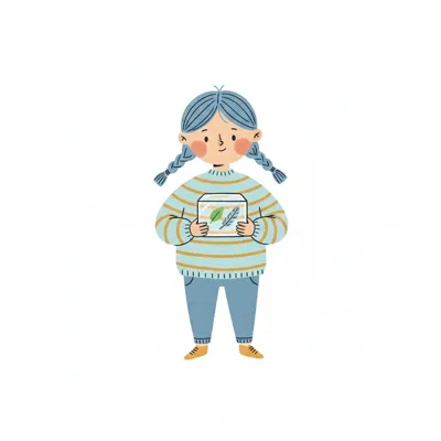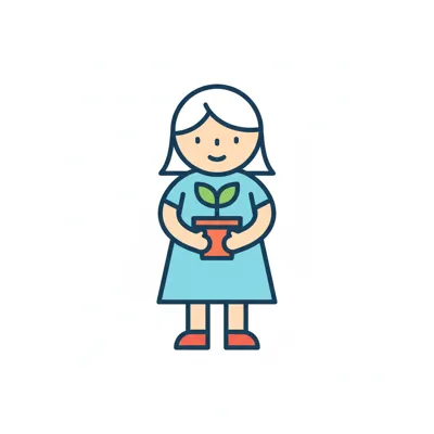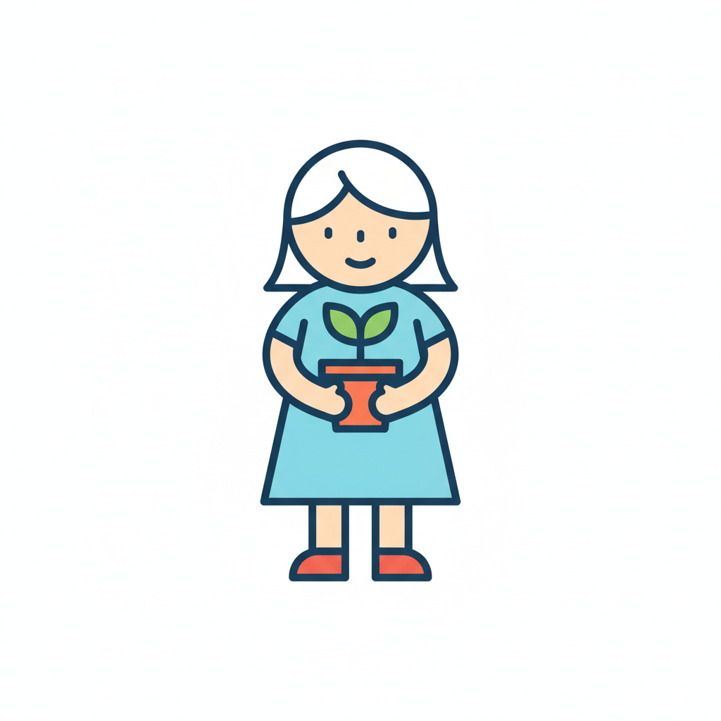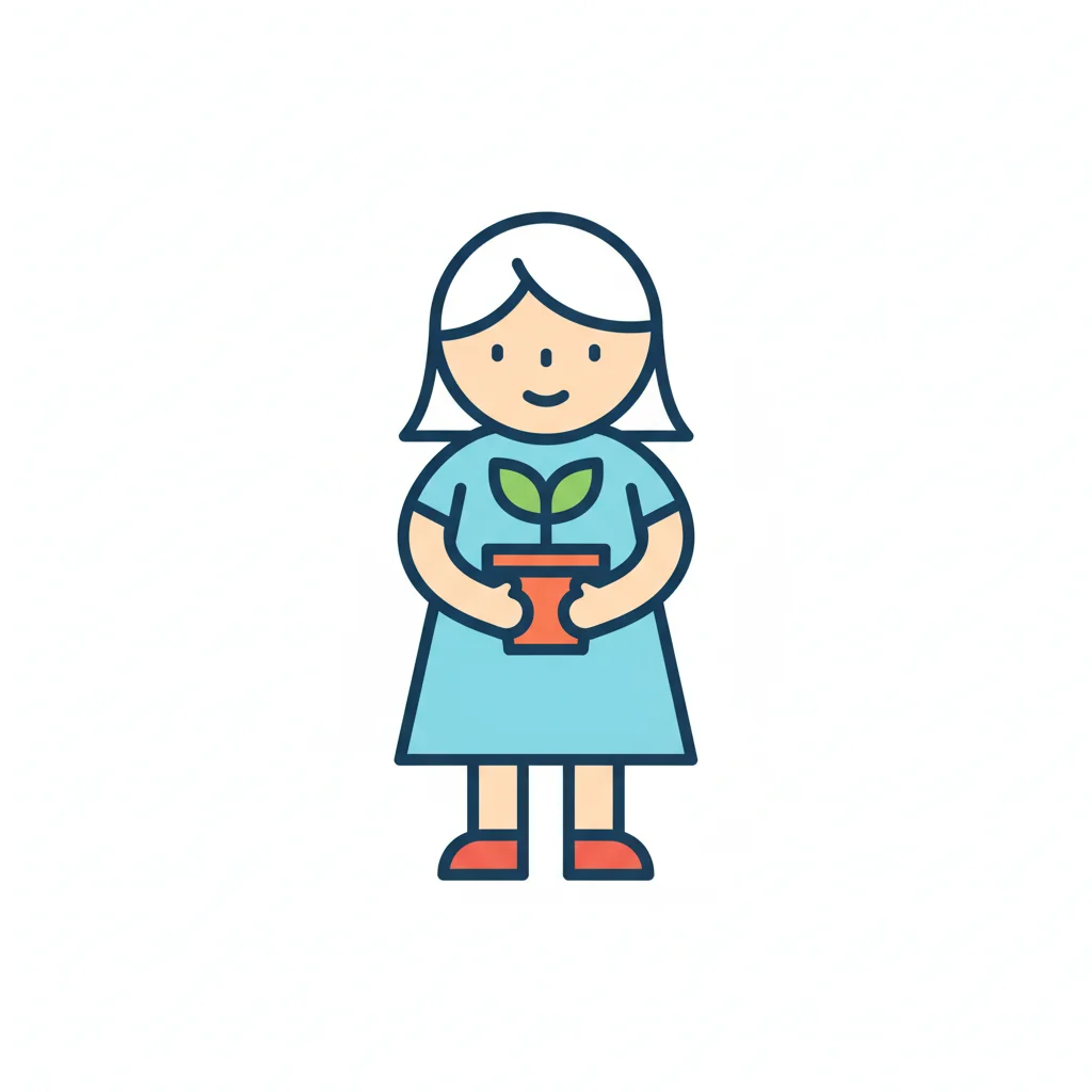Cartoon-Mädchen in blauem Kleid hält eine kleine Topfpflanze mit grünen Blättern.