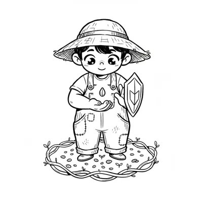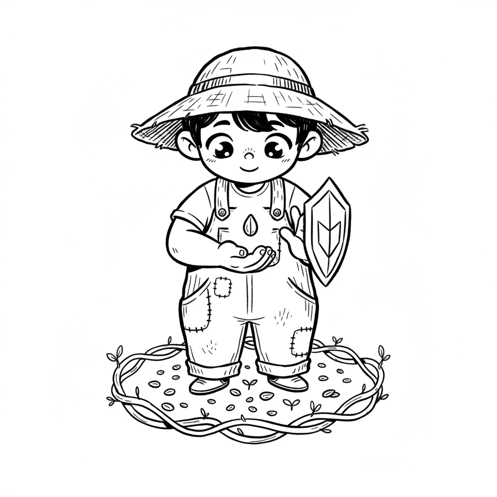 Niedlicher Cartoon-Junge mit Strohhut, der einen Samen und einen Schild mit Blattsymbol hält.