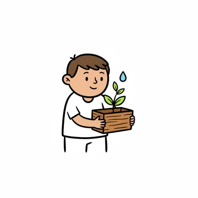 Cartoon Junge hält Pflanze in Holzkasten, darüber ein Wassertropfen.