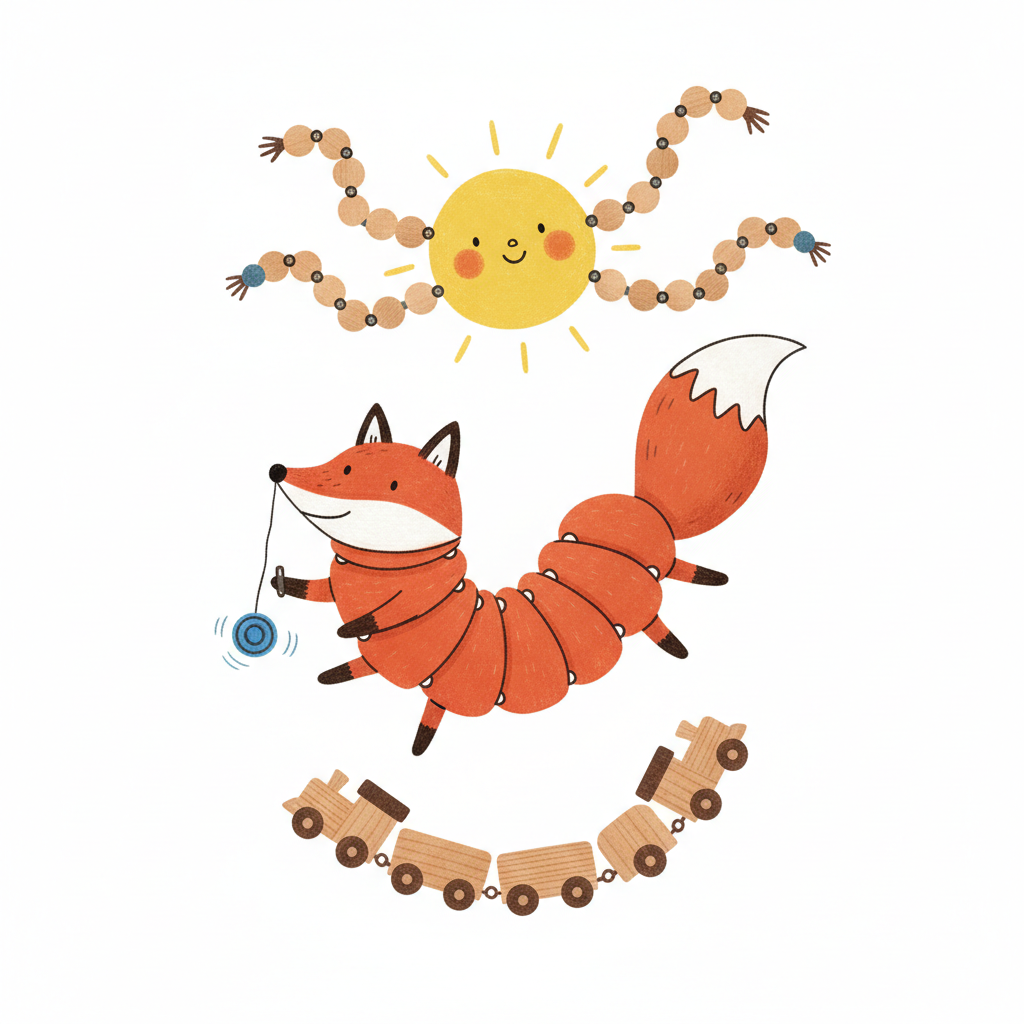 Fröhliche Illustration: Fuchs spielt Jo-Jo, lächelnde Sonne mit Perlenstrahlen, Holzspielzeugzug.