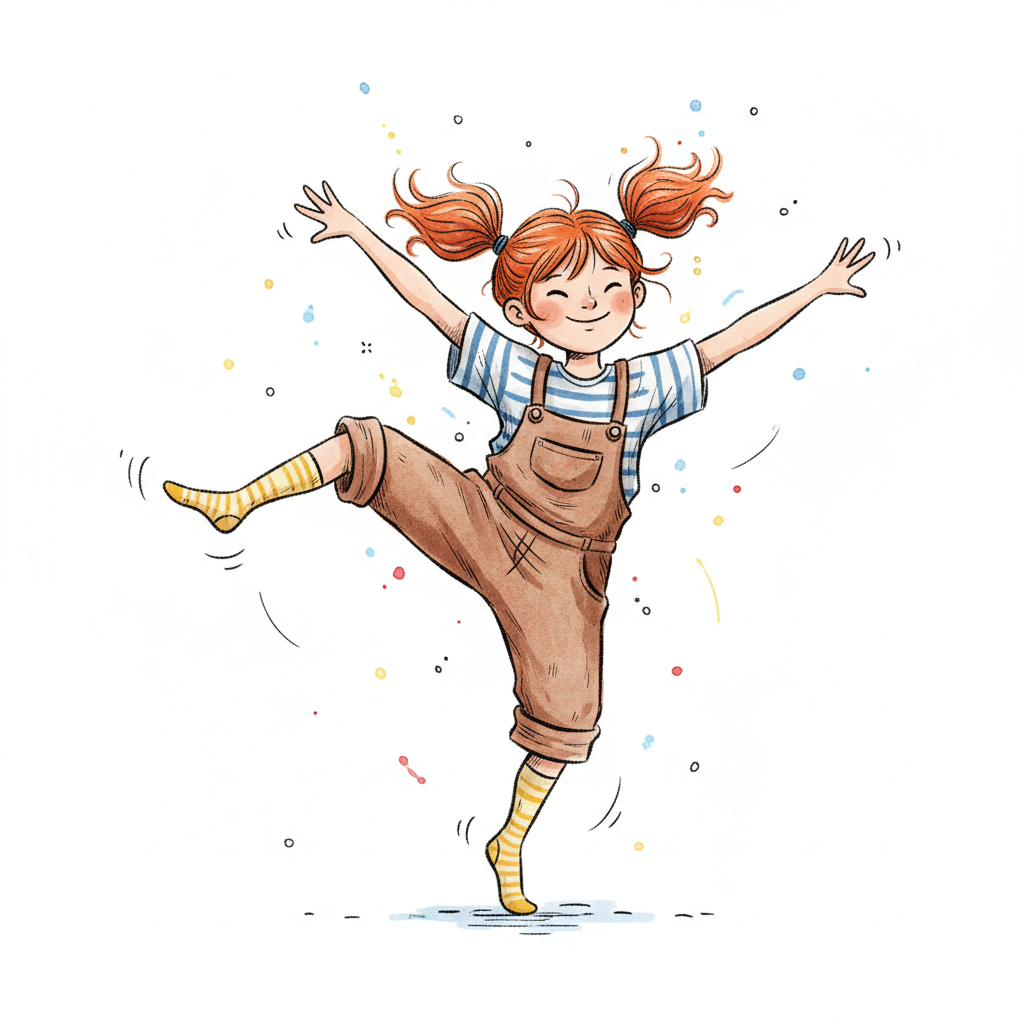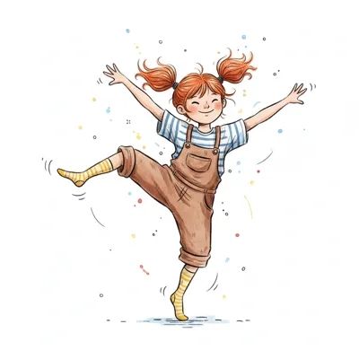 Fröhliches Mädchen mit roten Zöpfen tanzt ausgelassen in Latzhose, umgeben von bunten Punkten.