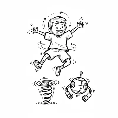 Ein fröhlicher Junge springt, umgeben von Wirbeln, neben einem Roboter und einem Strudel.