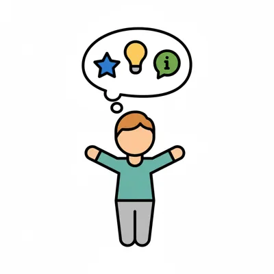 Stilisierte Person mit Gedankenblase, die eine Idee, Bewertung und Information enthält.