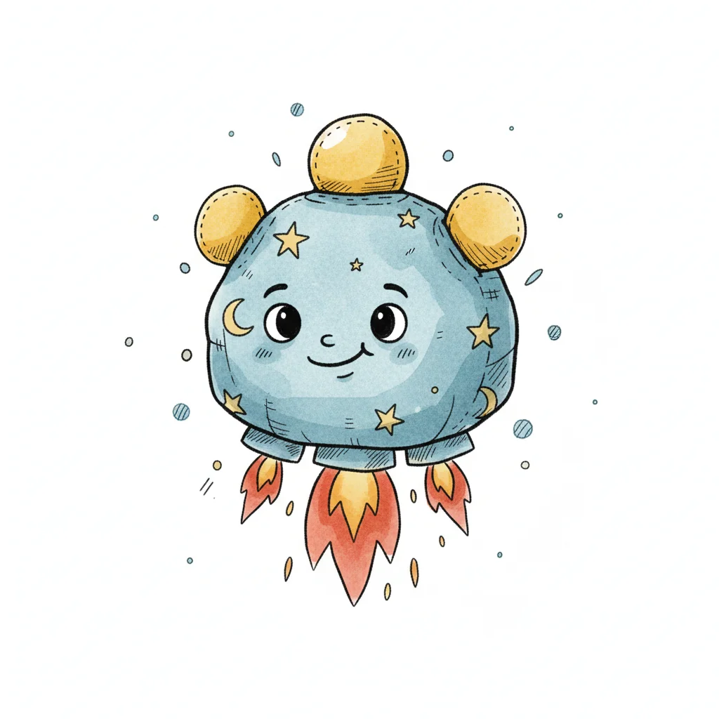 Niedliches, blaues Raketenwesen mit Sternen und Monden, das fröhlich abhebt.