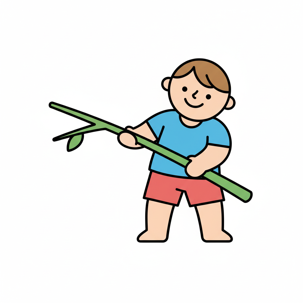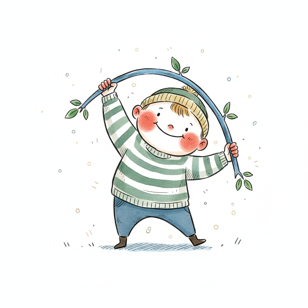 Ein fröhlicher Cartoon-Junge hält einen Ast mit Blättern und lächelt verschmitzt.