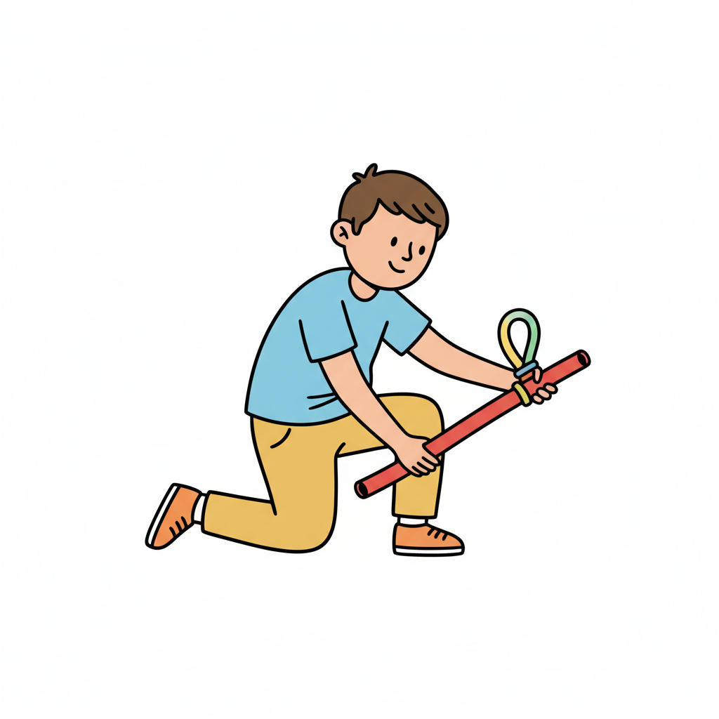 Junge kniet und hält einen roten Stock mit einer bunten Schlaufe.