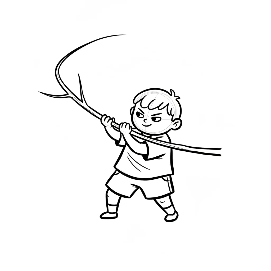 Ein Cartoon-Junge hält einen langen Stock und schaut entschlossen. Schwarz-Weiß-Illustration.