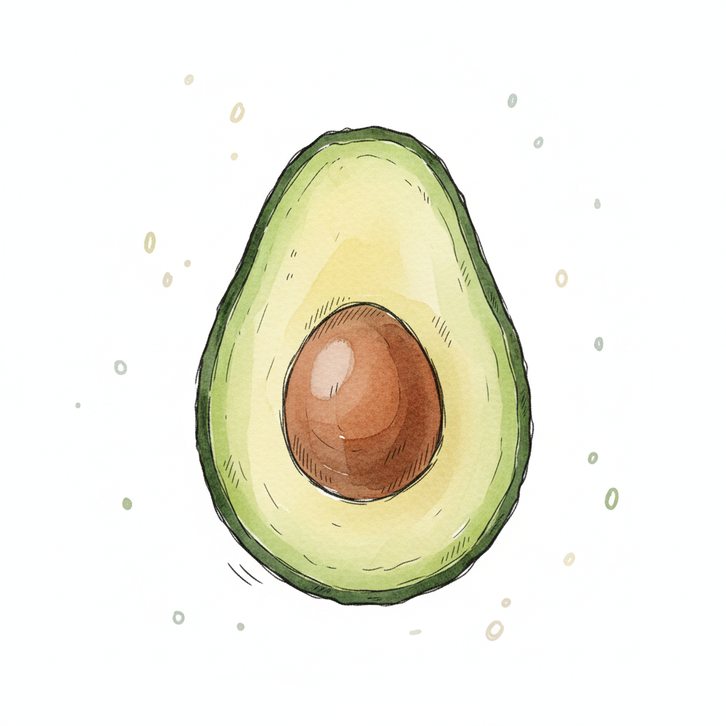 Aquarell-Illustration einer halbierten Avocado mit Kern auf weißem Hintergrund.