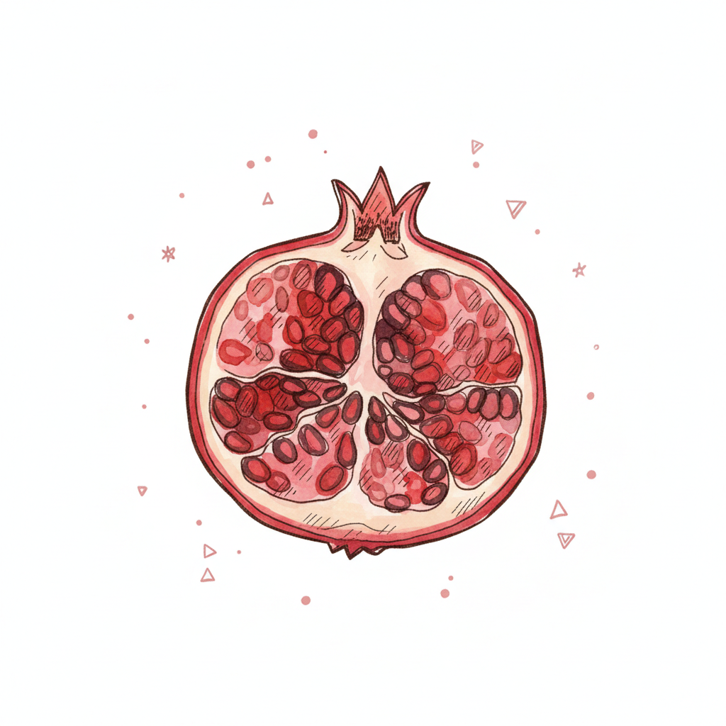 Aquarell-Illustration einer halbierten Granatapfelfrucht mit roten Kernen auf weißem Hintergrund.