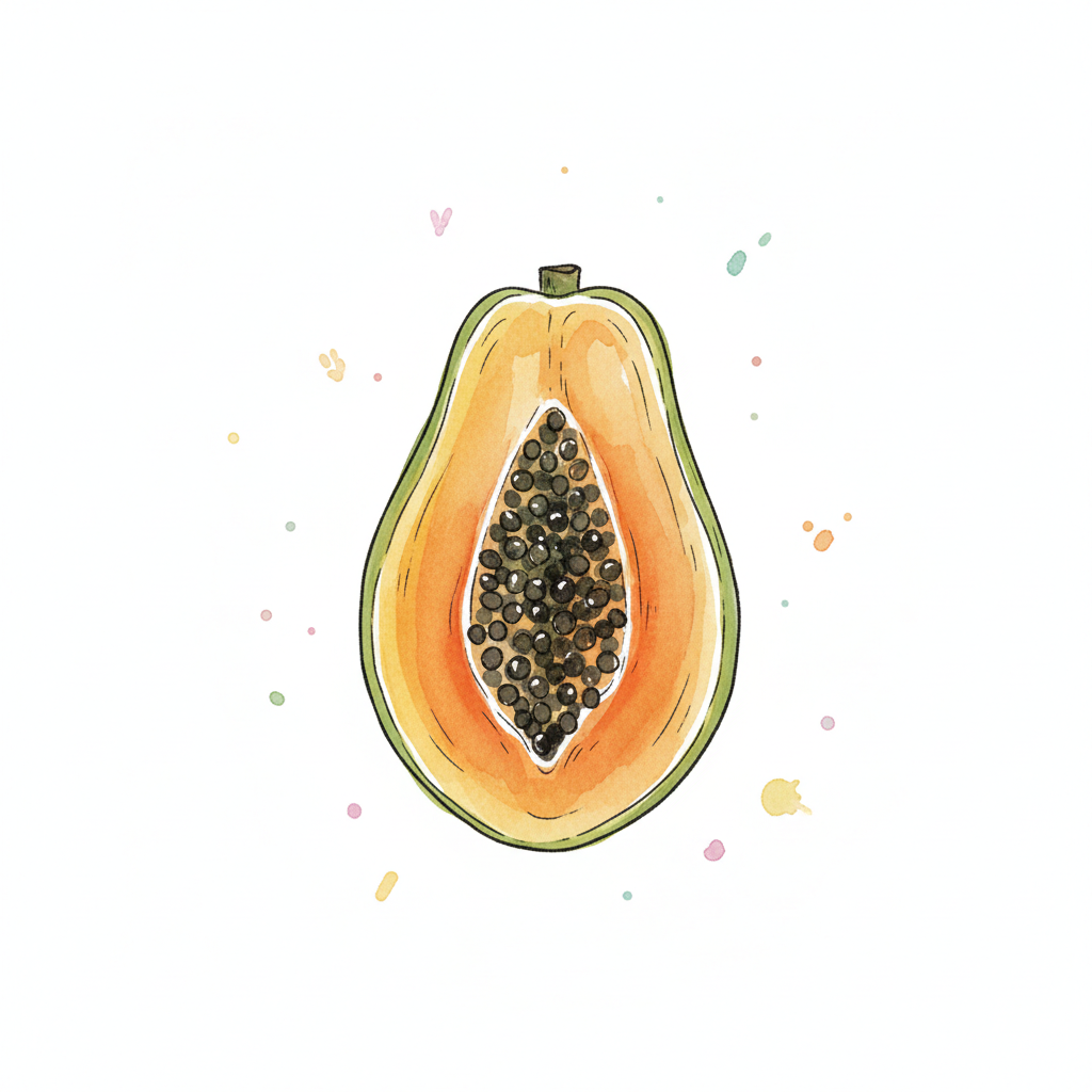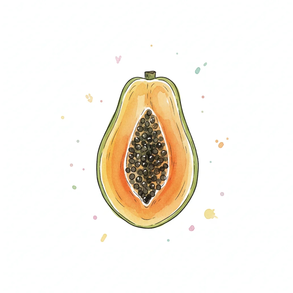 Aquarell-Illustration einer halbierten Papaya mit Kernen auf weißem Hintergrund, umgeben von Farbspritzern.
