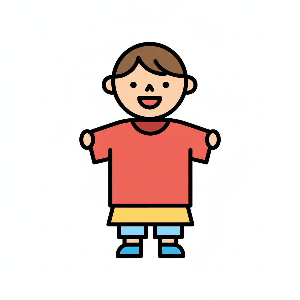 Stilisierte Zeichnung eines lächelnden Kindes in rotem Shirt, gelbem Rock und blauen Schuhen.