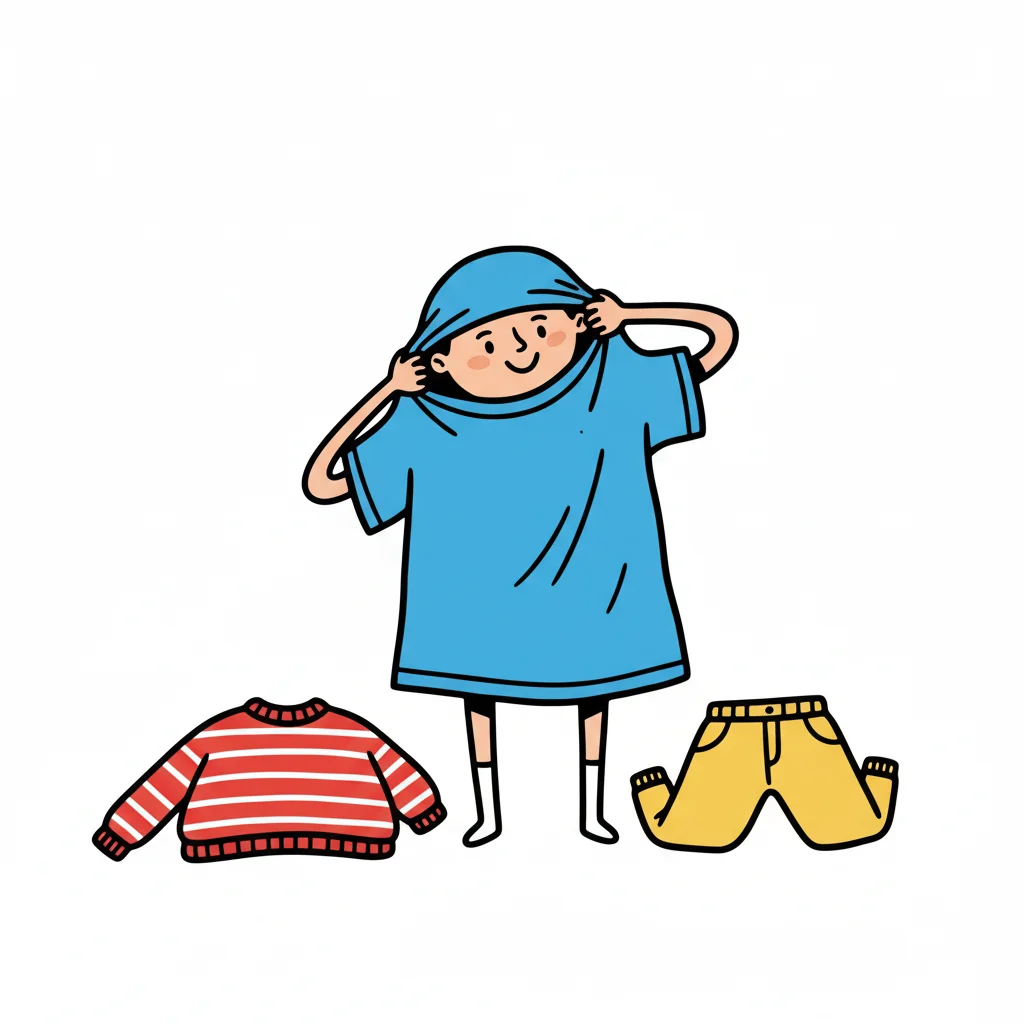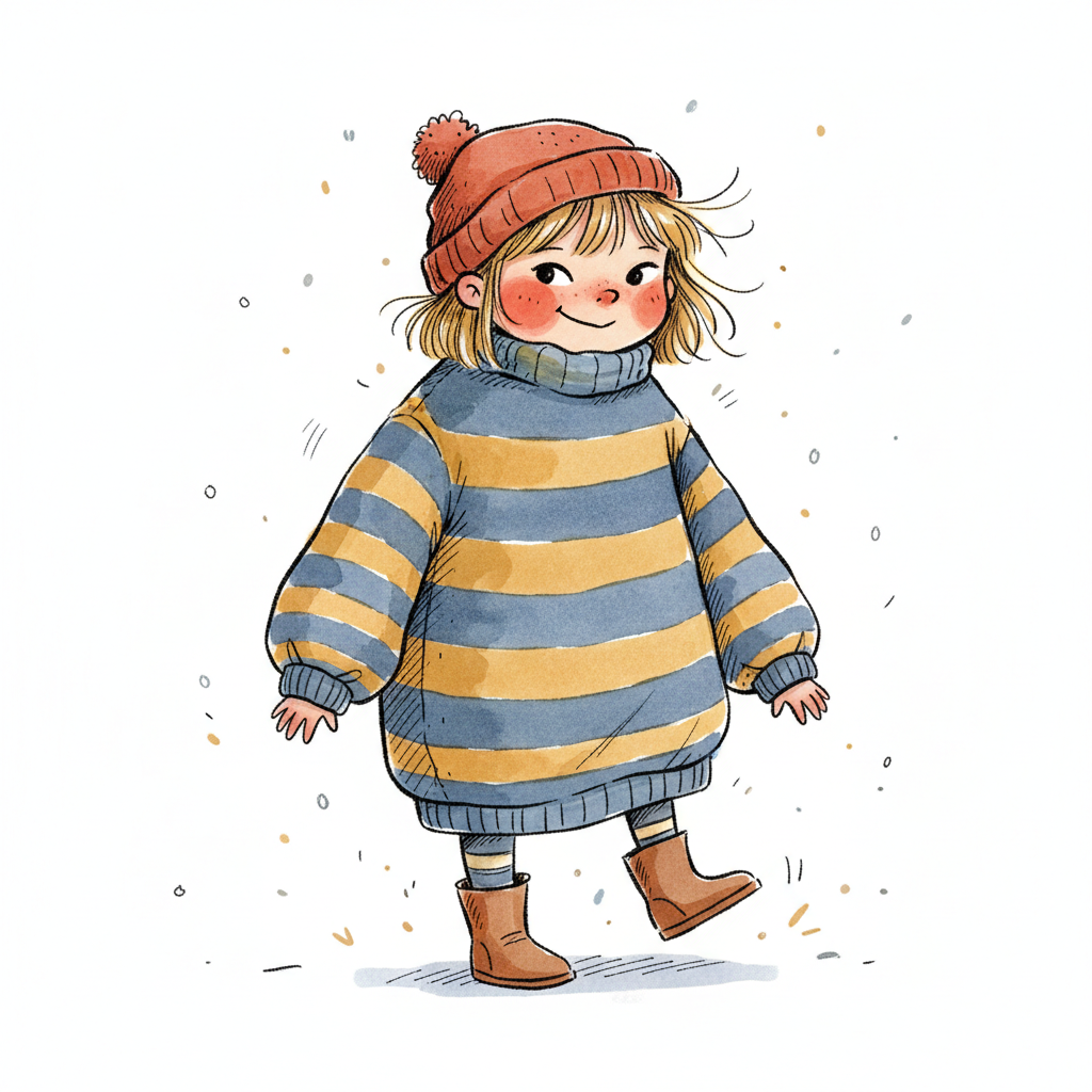 Niedliche, kindgerecht illustrierte Szene mit einem Kind oder einer Person als Hauptfigur, vor rein weißem Hintergrund, im frech-nordischen Aquarell-Skizzenstil. Klare, leicht wackelige Tuschekonturen, sichtbare Pinsel- und Strichtextur, dezente Schraffuren, weiche handgemalte Farbflächen in gedeckten Farben. Einfache, runde Formen. Keine harten Schatten, sondern sanfte, transparente Aquarellschichten. Leicht raue, handgezeichnete Linien statt glatter Vektorkanten. Subtile, vereinzelte Kritzelpunkte oder kleine Details im Hintergrund (wie Pünktchen oder feine Striche), aber keine echte Umgebung oder Landschaft. Die Figur ist mittig zentriert. Insgesamt charmant, humorvoll, warm und handgemacht wirkend. WICHTIG: Das Bild darf ABSOLUT KEINEN TEXT, KEINE BUCHSTABEN und KEINE ZAHLEN enthalten.