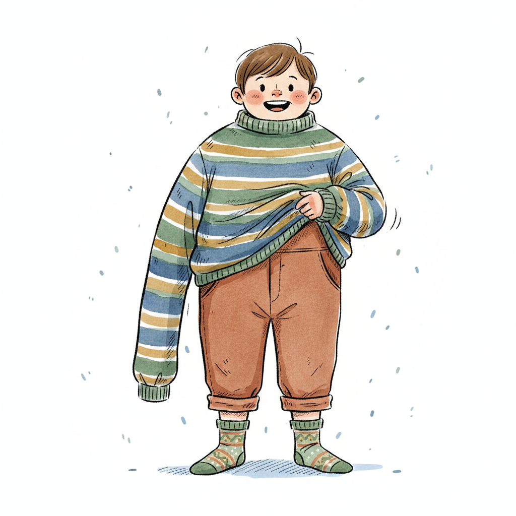 Fröhlicher Cartoon-Junge in einem gestreiften Rollkragenpullover und braunen Hosen.