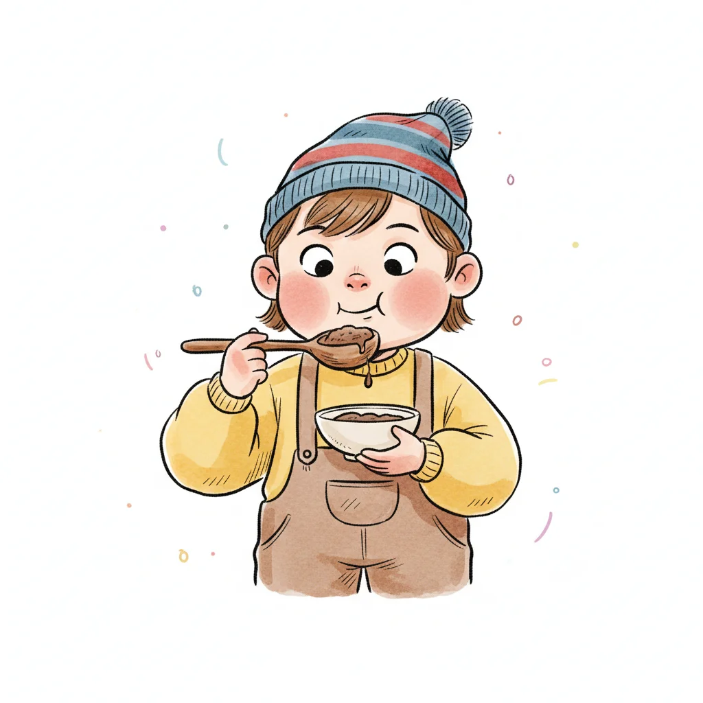 Ein niedliches Cartoon-Kind mit Mütze und Latzhose isst genüsslich aus einer Schüssel.