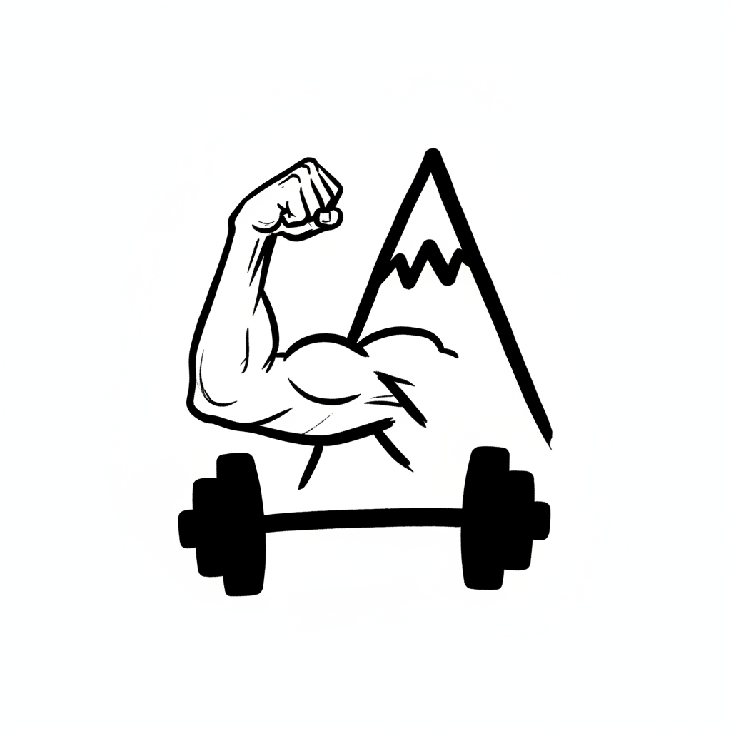 Schwarz-weiß-Illustration eines Bizeps, Berges und einer Hantel, symbolisiert Stärke und Natur.