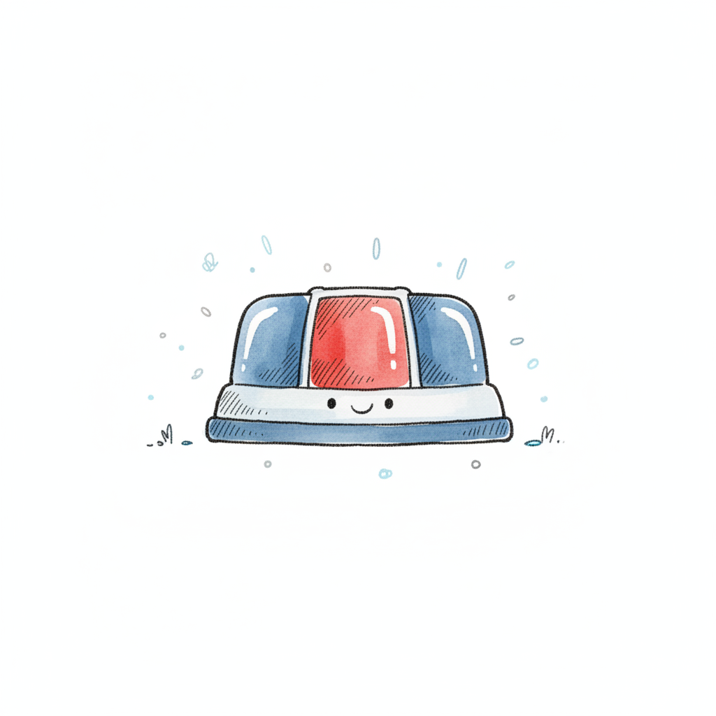 Bunte Illustration einer blauen Warnleuchte mit gelbem Sockel und Schaltern, umgeben von Blitzen.