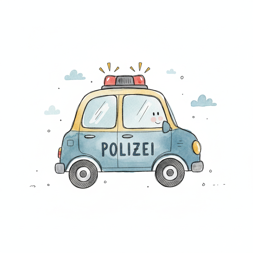 Bunt gezeichnetes Polizeiauto mit Blaulicht und Sirene.