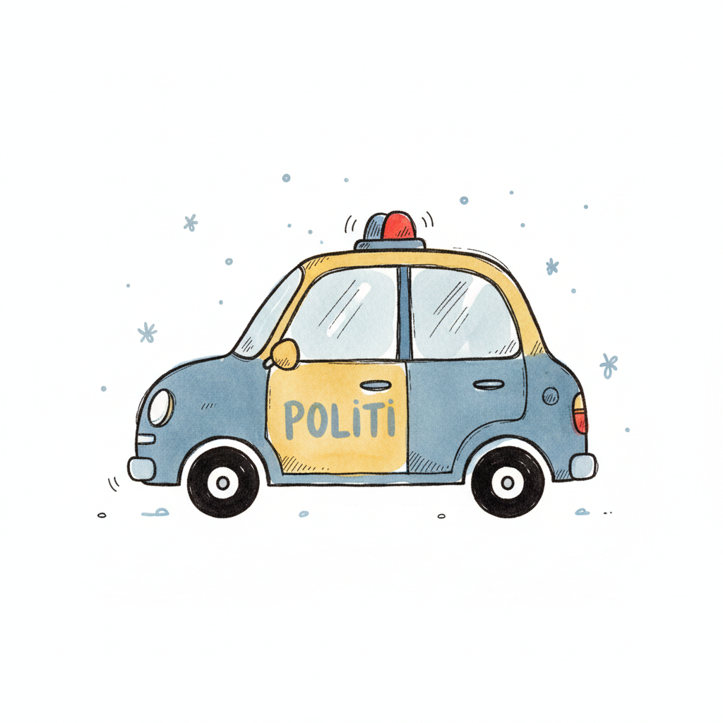 Niedliches, handgezeichnetes Polizeiauto in Blau und Gelb mit 'POLITI' Aufschrift und Blaulicht.