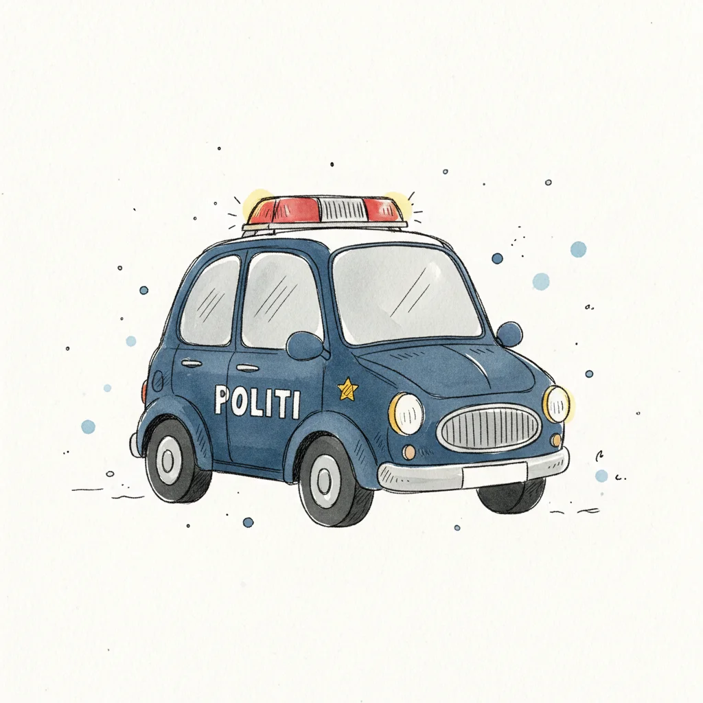 Niedliches, blaues Cartoon-Polizeiauto mit 'POLITI'-Aufschrift und Blaulicht auf weißem Hintergrund.