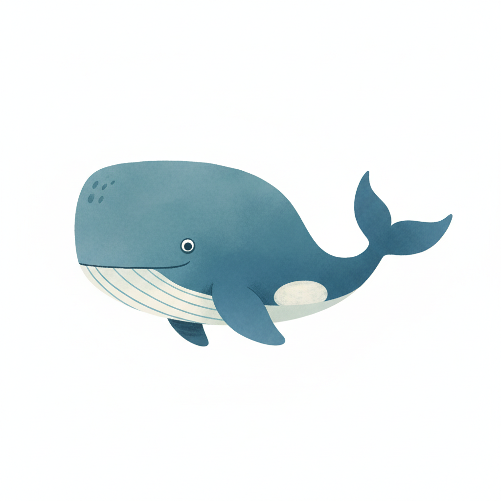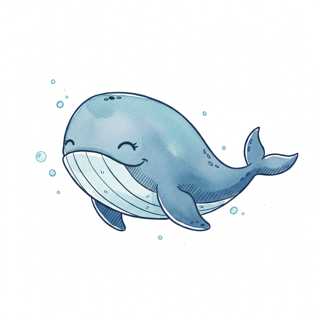 Eine gezeichnete Walfischfigur schwimmt im Wasser.