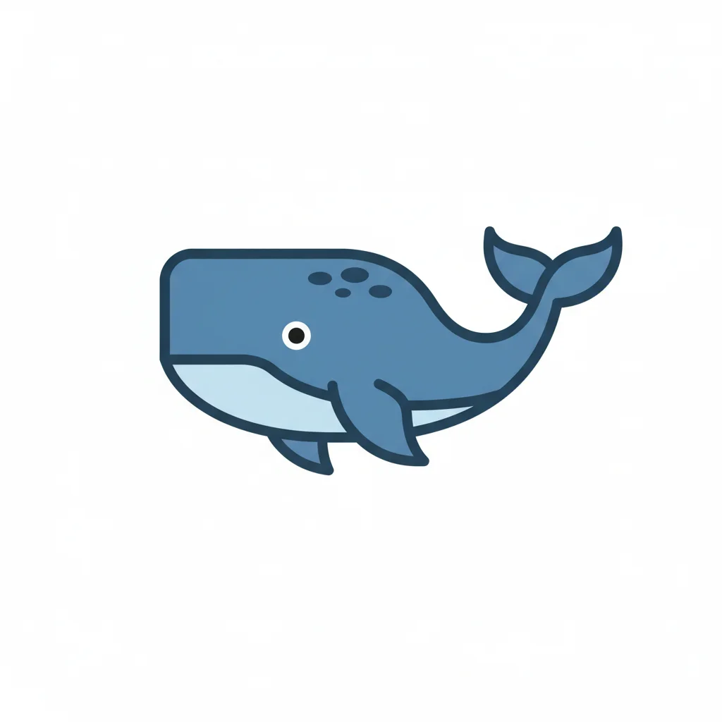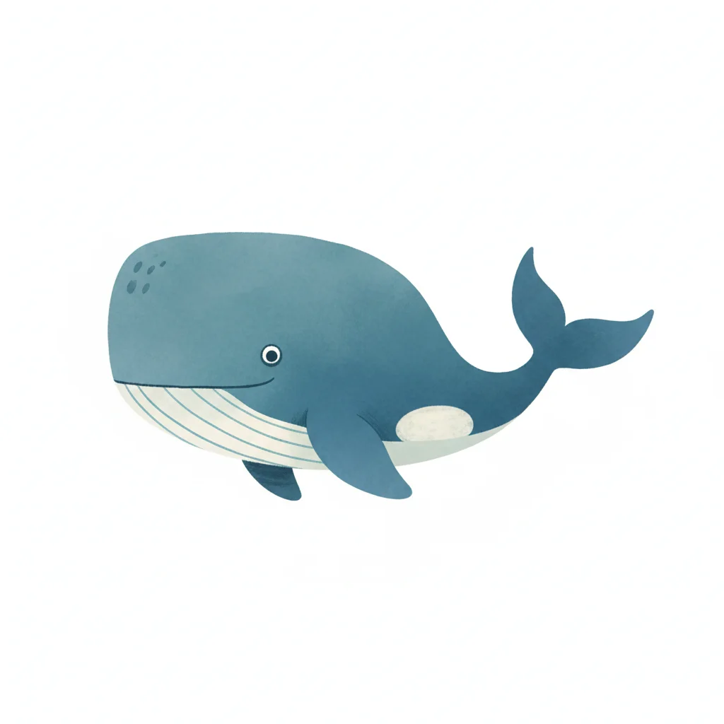 Ein stilisierter blauer Wal schwimmt in einfacher Grafik.