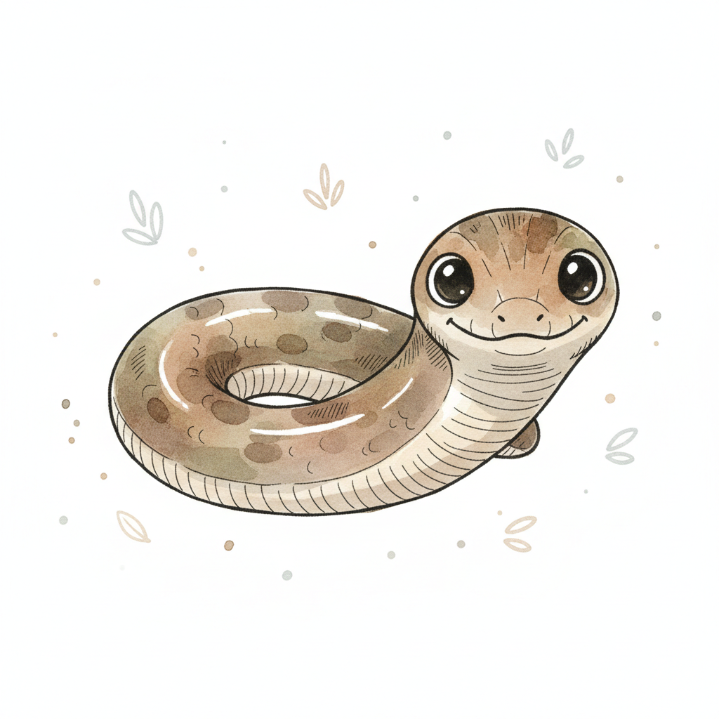 Süße, cartoonhafte Schlange mit großen Augen und einem lächelnden Gesicht.