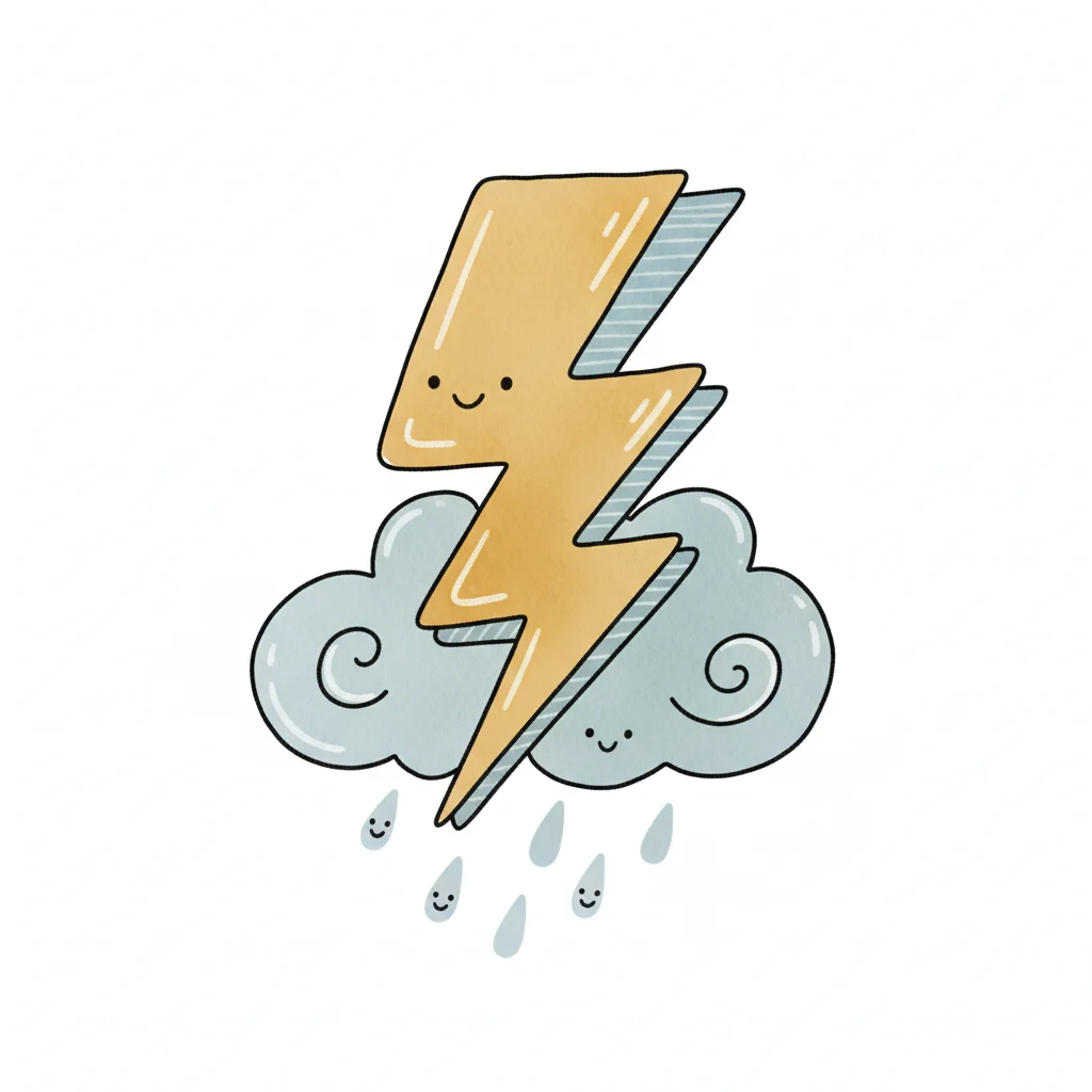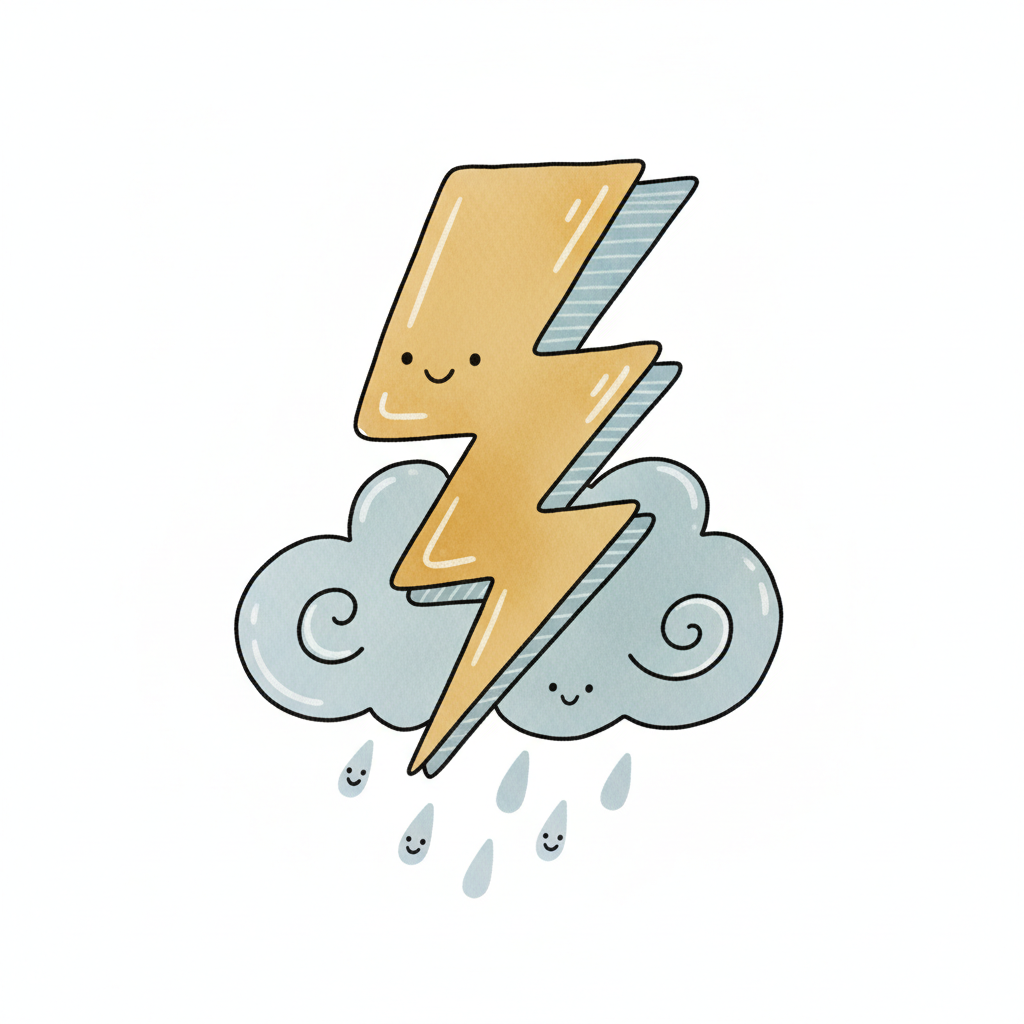 Ein fröhlicher Blitz mit Wolken und Regentropfen.