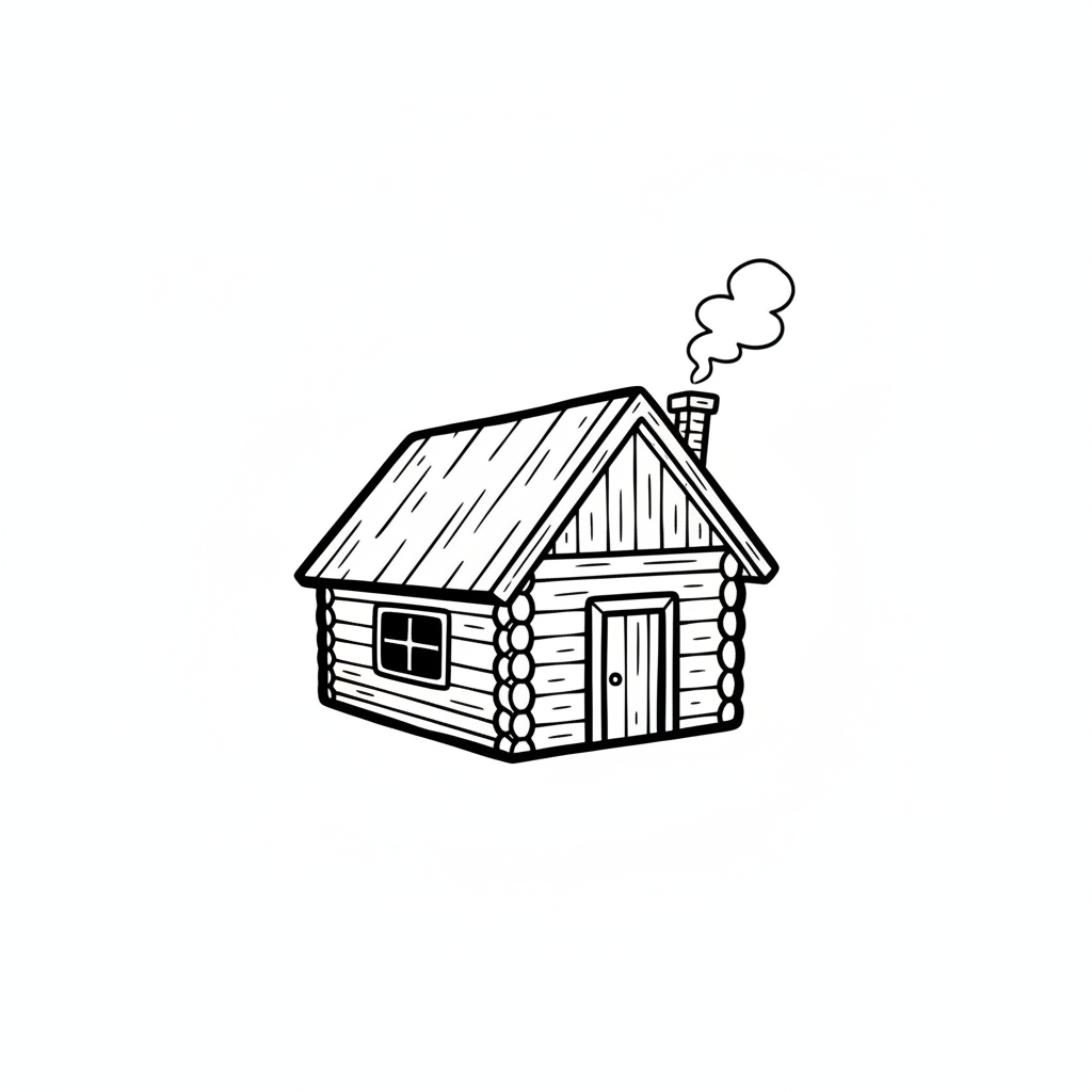 Schwarz-weiße Cartoon-Zeichnung einer Blockhütte mit rauchendem Schornstein.