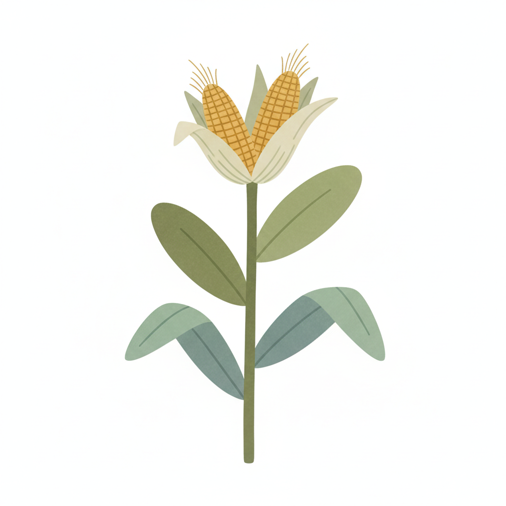 Ein stilisierter Blumenstängel mit Maiskolben und grünen Blättern.