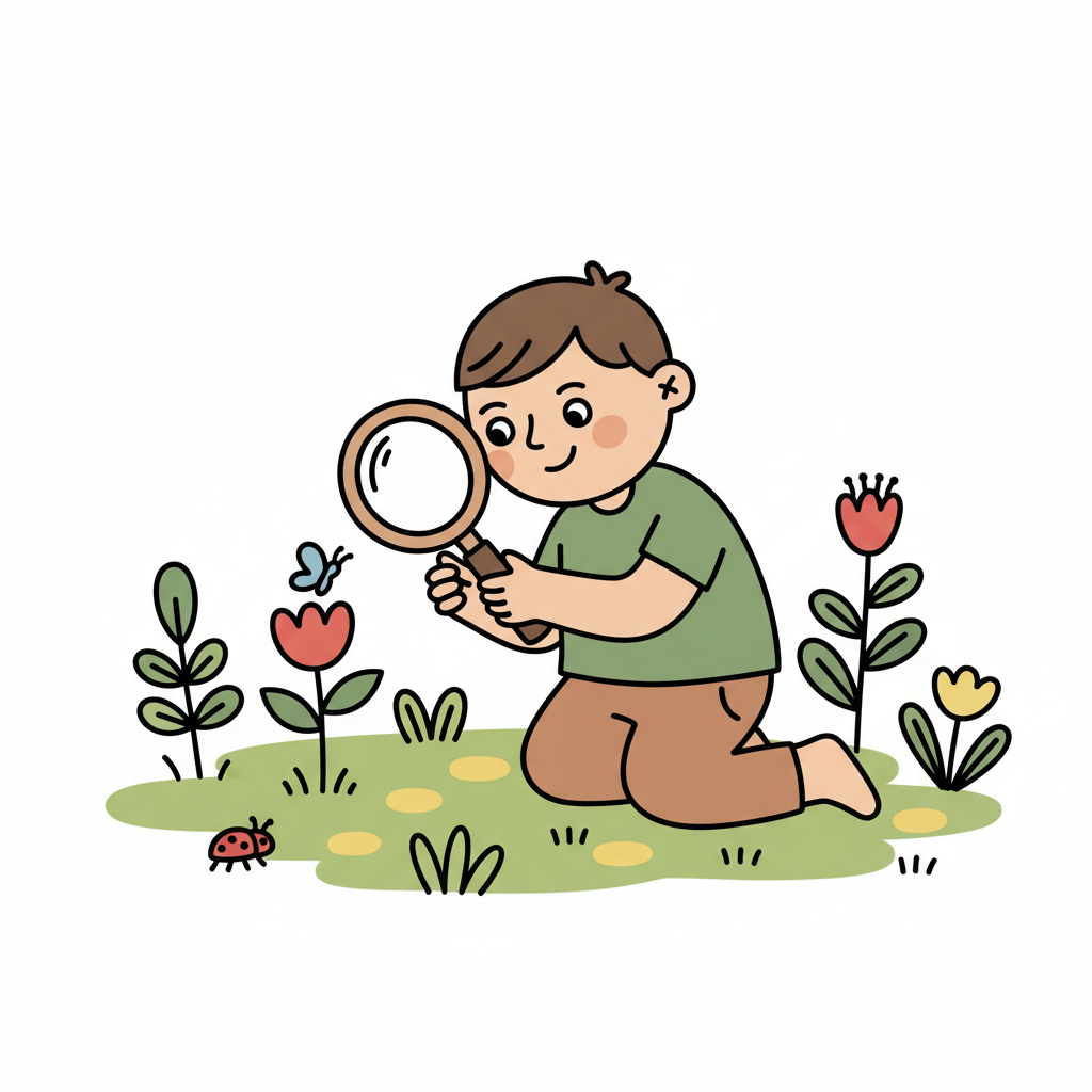 Junge erkundet mit Lupe die Natur, beobachtet Schmetterling und Marienkäfer auf Blumenwiese.
