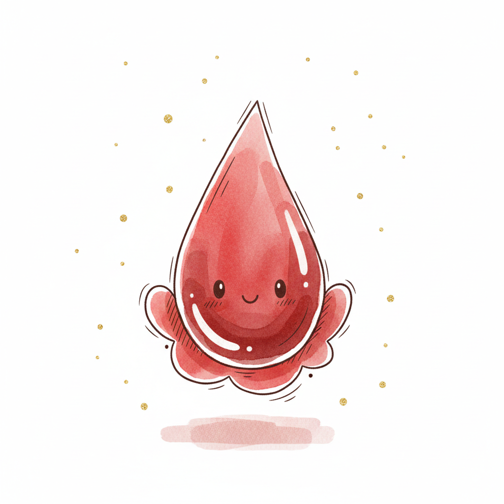 Niedlicher, lächelnder Blutstropfen im Cartoon-Stil, umgeben von goldenen Punkten.