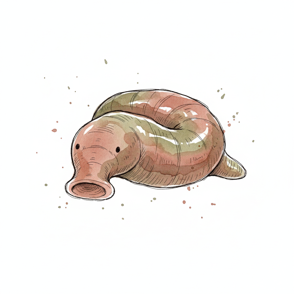 Niedliche, wurmartige Kreatur mit großem Mund und kleinen Augen, gezeichnet im Aquarellstil.