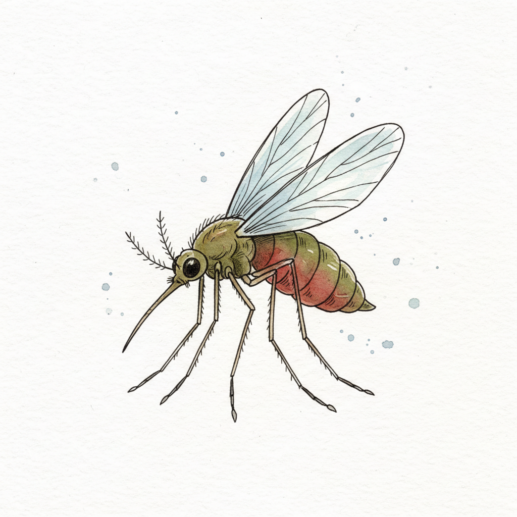Detailreiche Illustration einer Stechmücke mit blutgefülltem Bauch auf weißem Hintergrund.