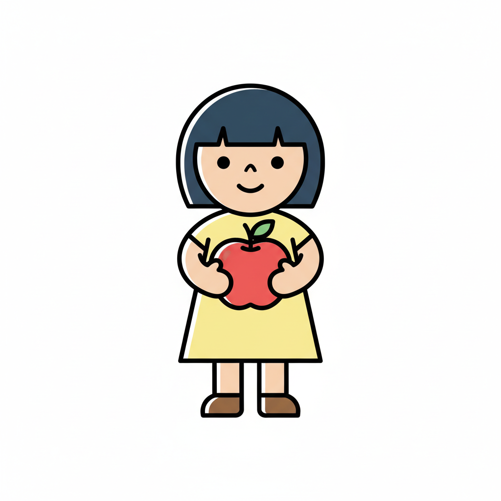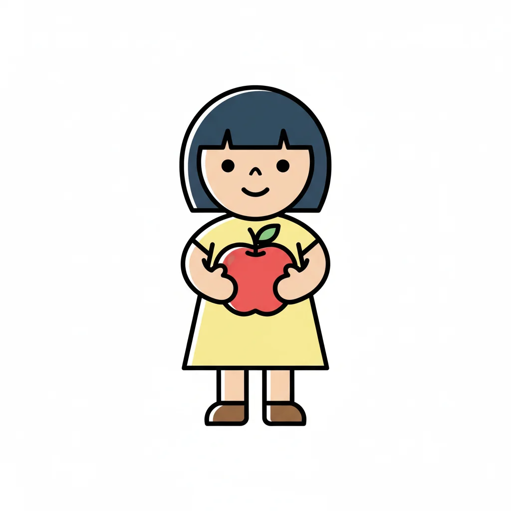 Ein lächelndes Cartoon-Mädchen mit Bob-Frisur in gelbem Kleid hält einen roten Apfel.