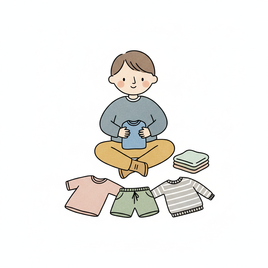 Ein Junge faltet Kleidung auf dem Boden sitzend.