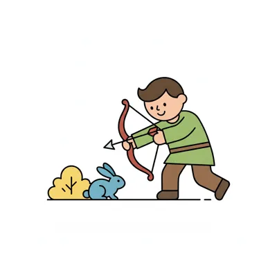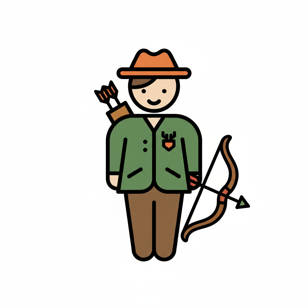 Illustration eines Bogenschützen in grüner Jacke und Rucksack, der mit Pfeil und Bogen zielt.