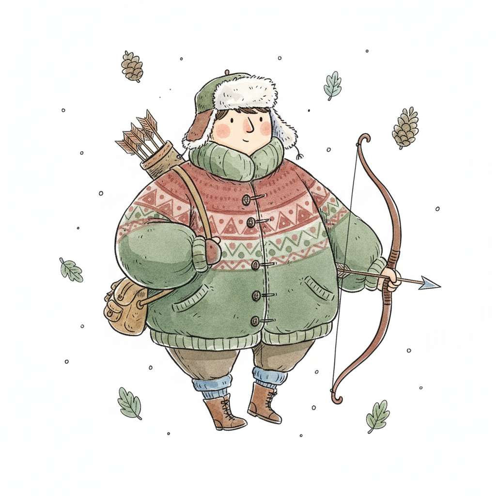 Niedliche, mollige Figur in Winterkleidung mit Bogen und Köcher, umgeben von Blättern und Zapfen.