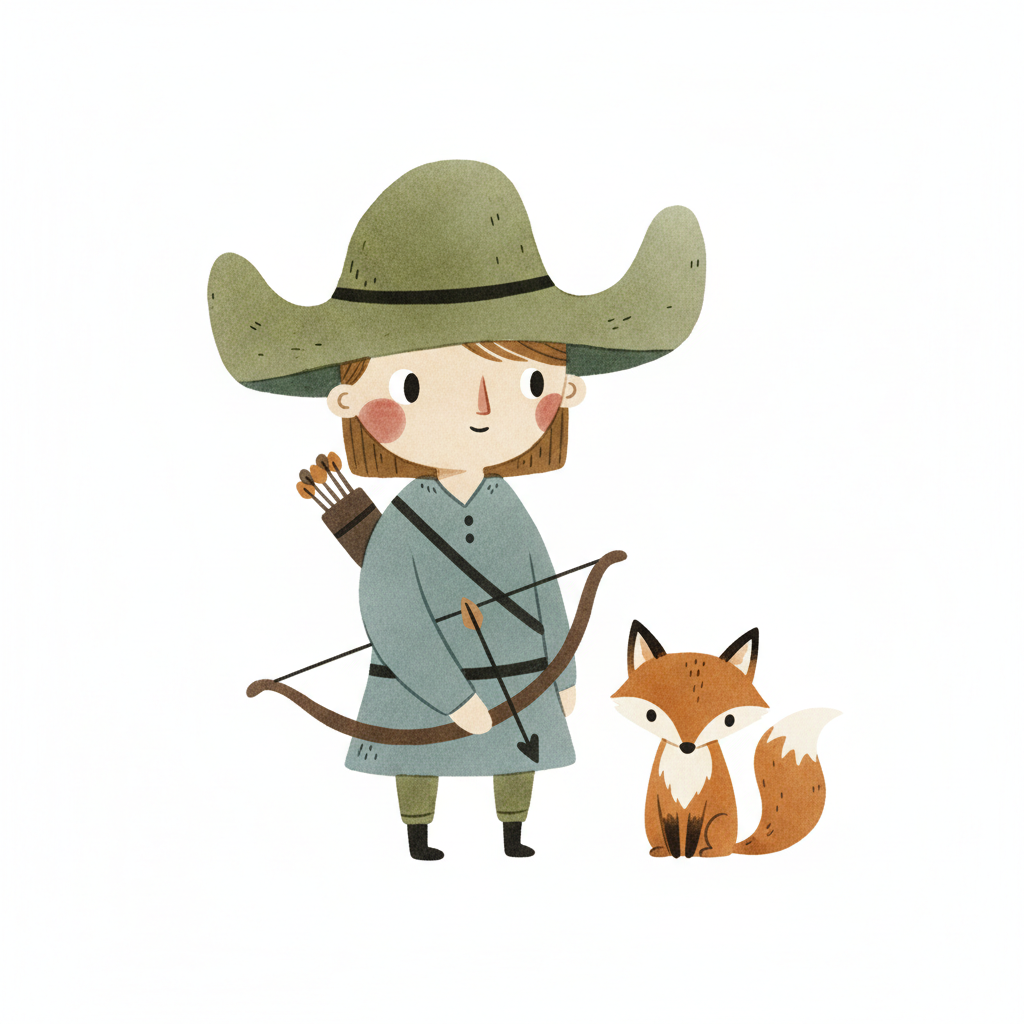 Niedliche Illustration eines Bogenschützen mit Hut und Fuchs auf weißem Hintergrund.