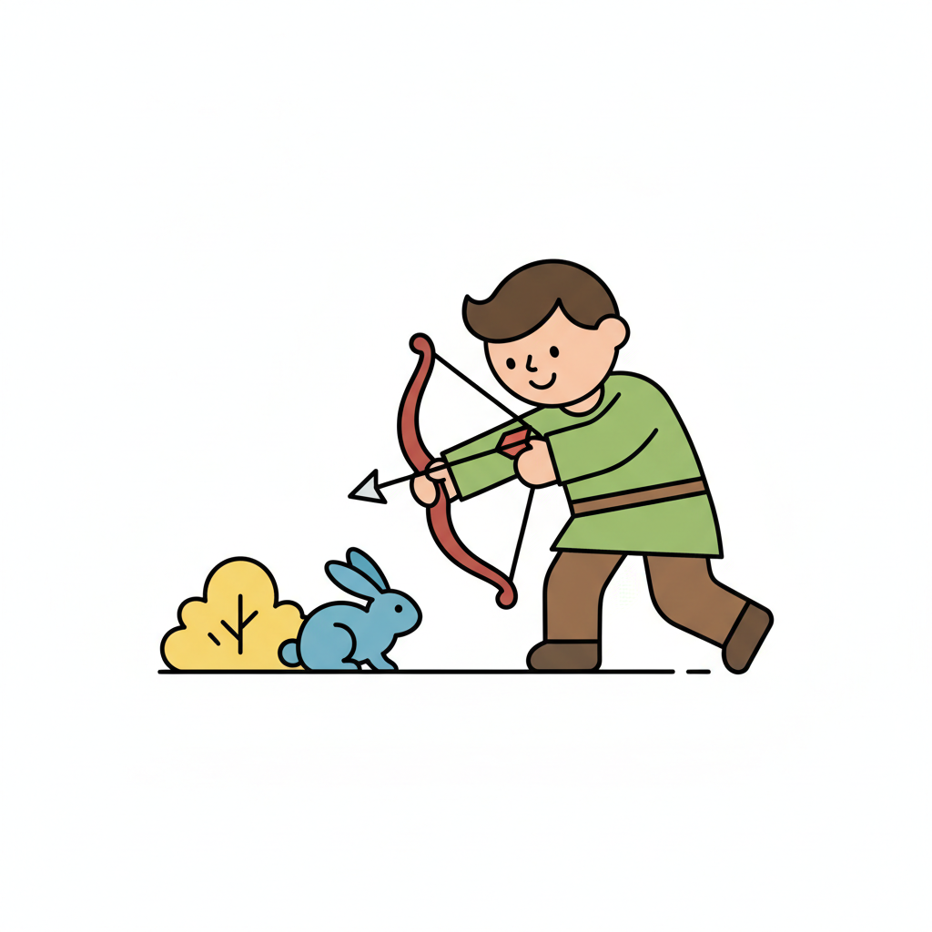 Cartoonfigur zielt mit Pfeil und Bogen auf einen blauen Hasen neben einem Busch.