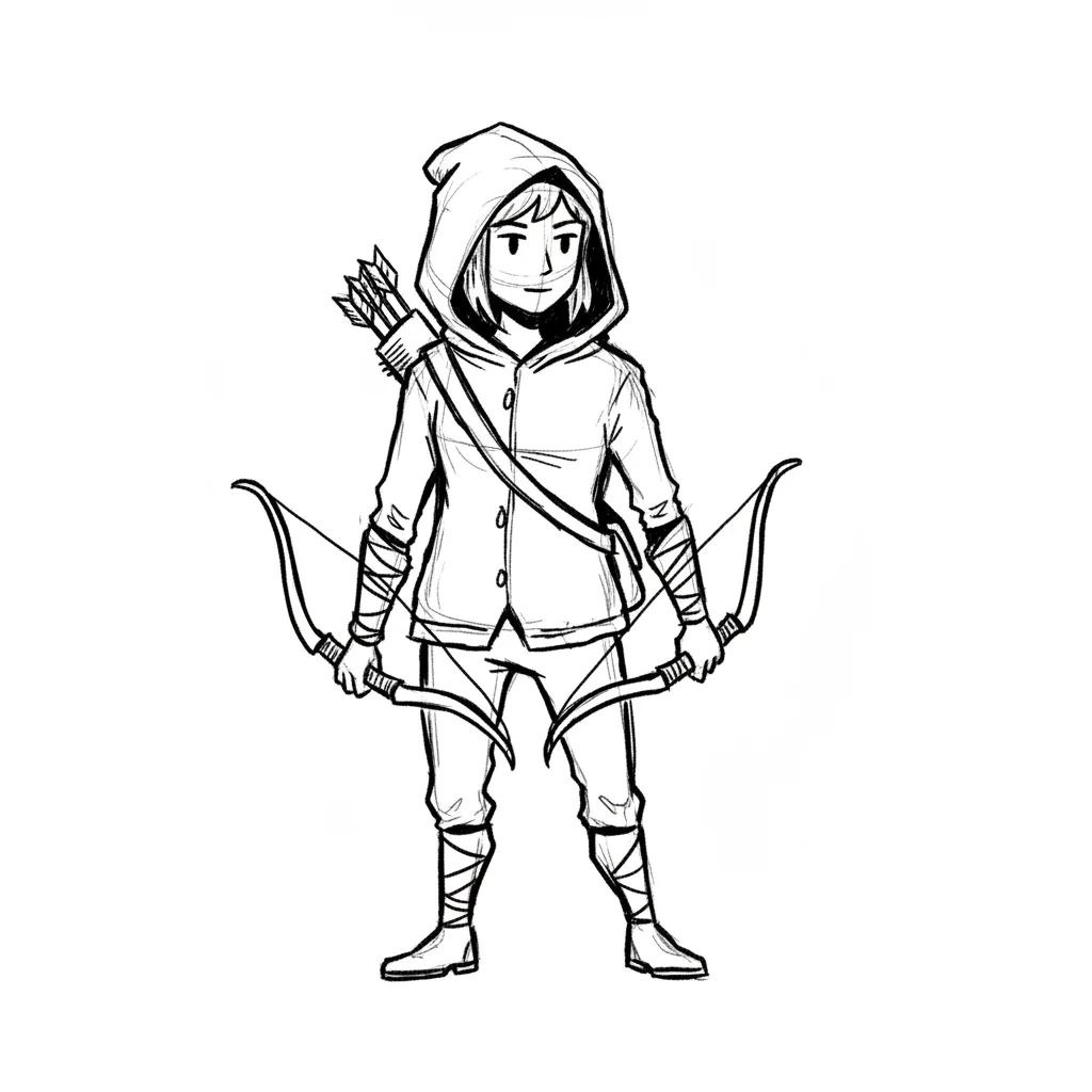 Schwarz-weiße Skizze eines Bogenschützen mit Kapuze, Köcher und zwei Bögen in den Händen.