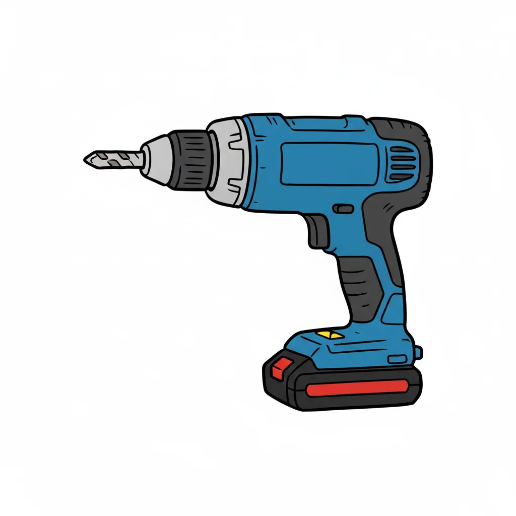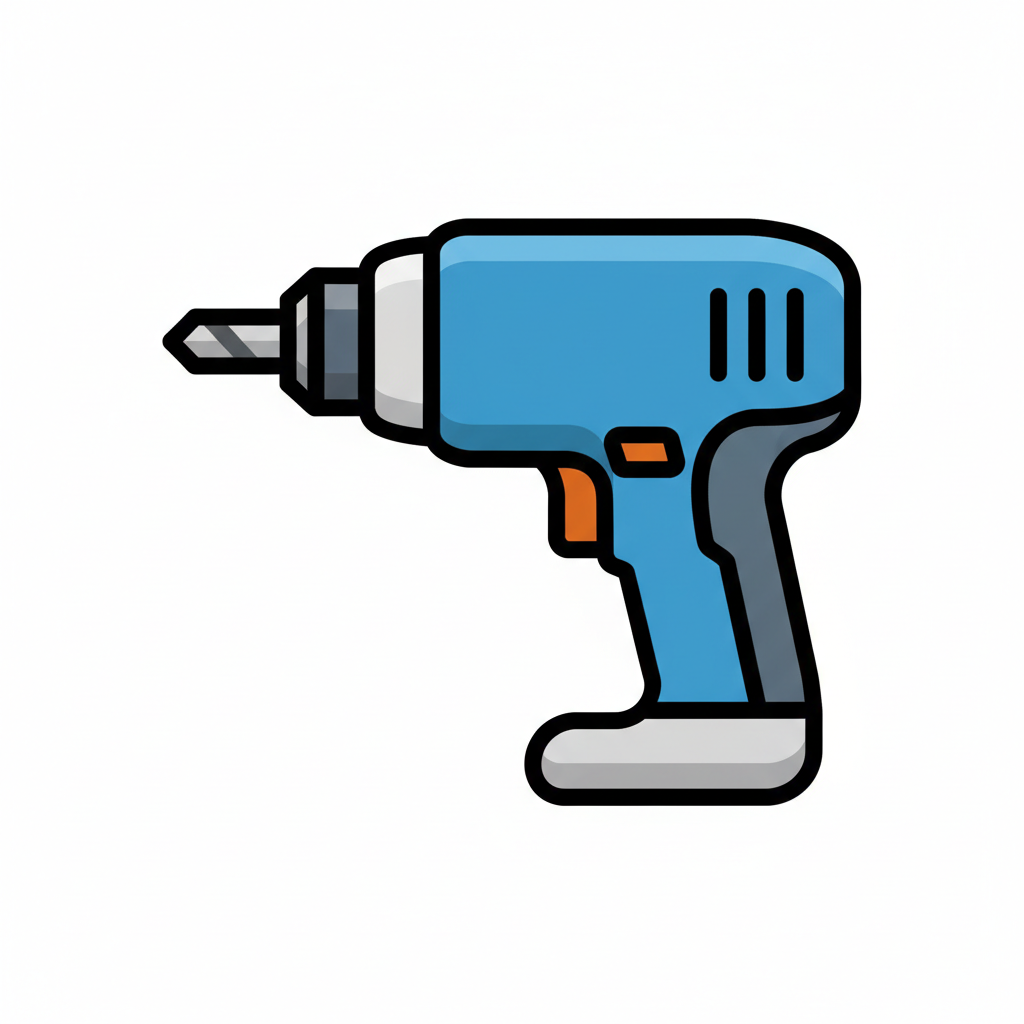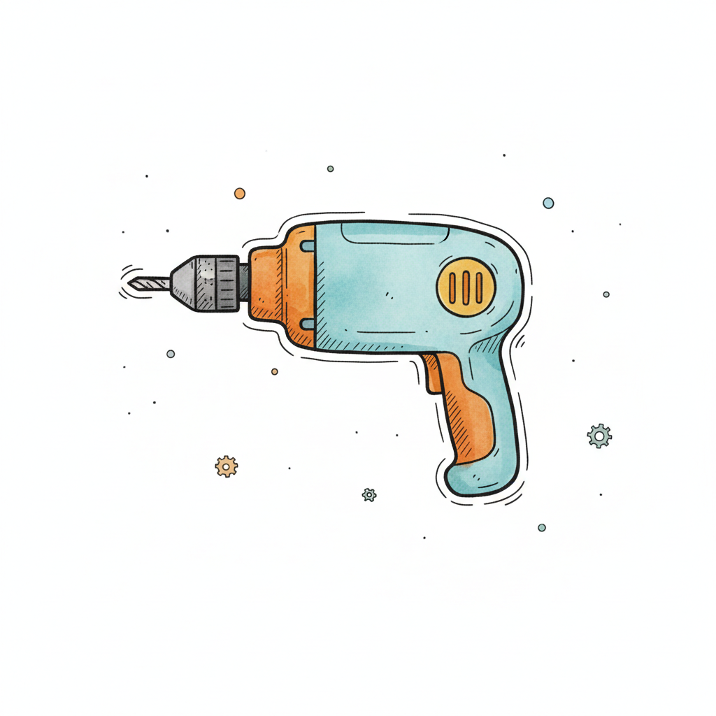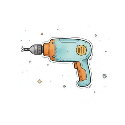 Cartoon-Stil Illustration einer blauen und orangefarbenen Bohrmaschine mit kleinen Details.